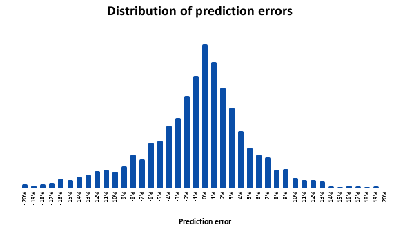 Beyond average error, we look at the range of actuals versus what our model predicted to understand not just average error, but the typical error range.